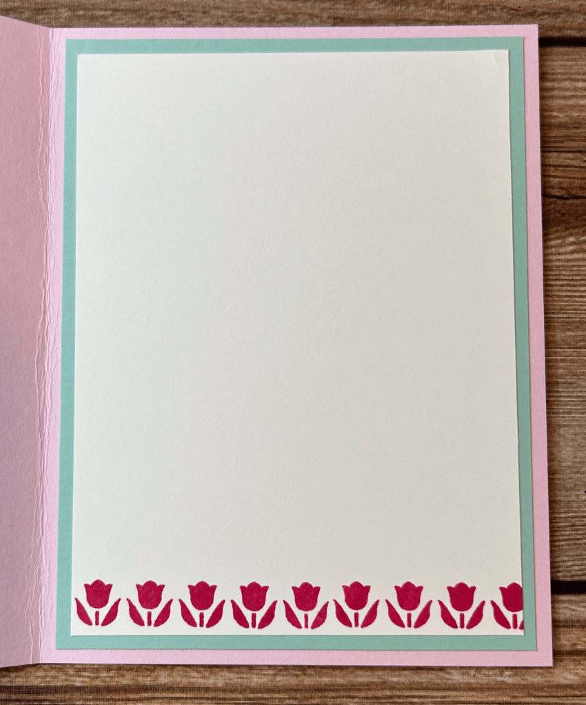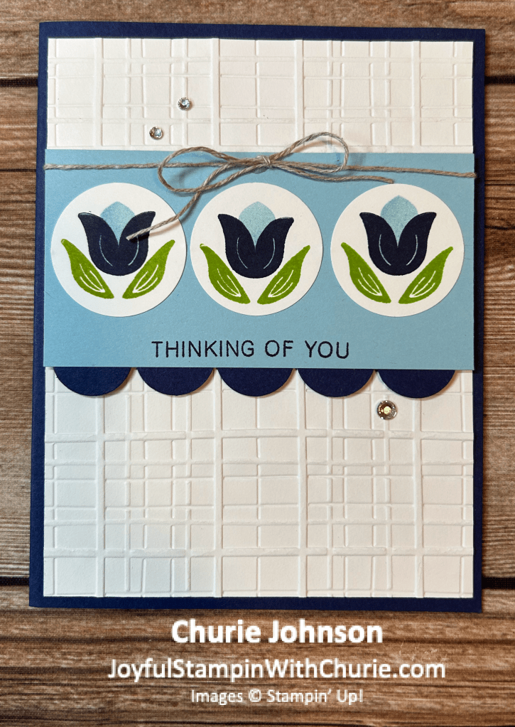 I created the Night of Navy scallop edging on the front of the card by using circles (half of the circles are glued to the Balmy Blue layer. To add some pizzaz to the card, I raised up the Balmy Blue layer that has the three tulips on it with Stampin’ dimensionals, used linen thread to tie a bow around the Balmy Blue layer, and added some rhinestone basic jewels.