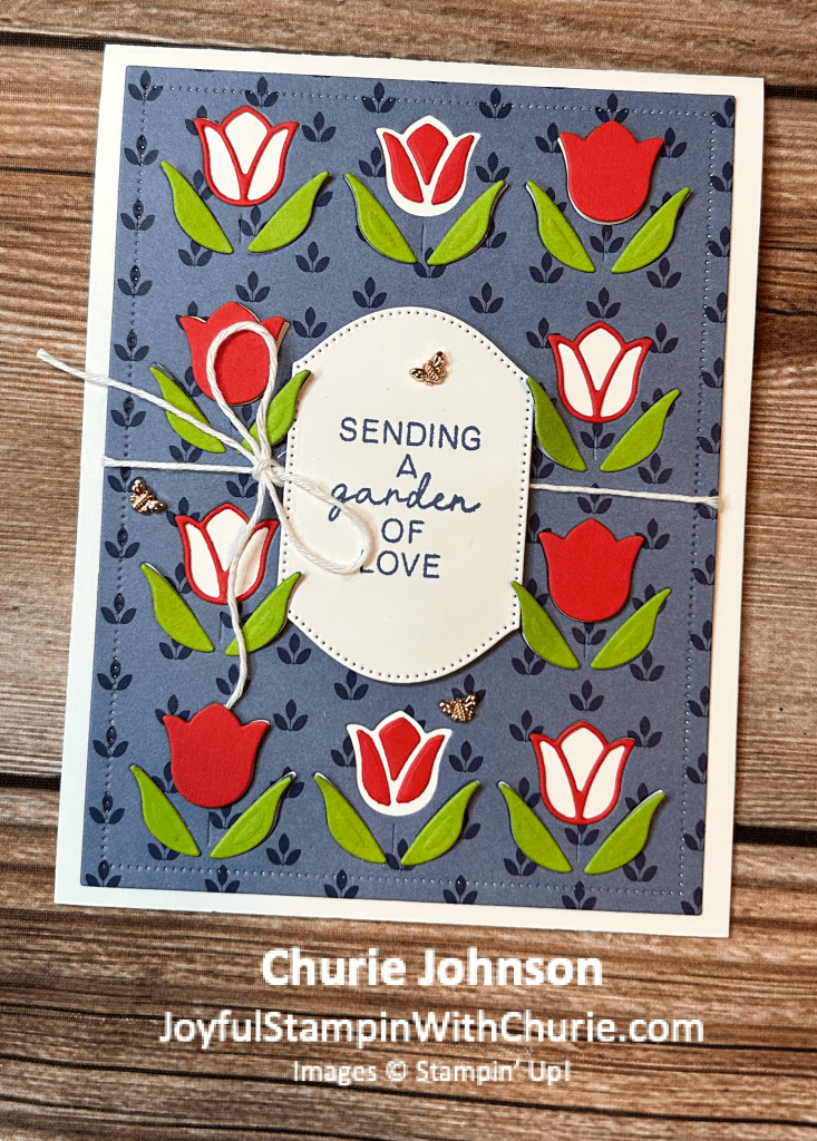 For this card featuring the Stampin’ Up Sunshine & Tulips bundle I decided to use the True Blue Florals 12″ x 12″ Designer Series Paper (DSP) which was the December Product of the Month that is still available to purchase for $5.00 (while supplies last) when you place a qualifying Stampin’ Up order of $75.00.