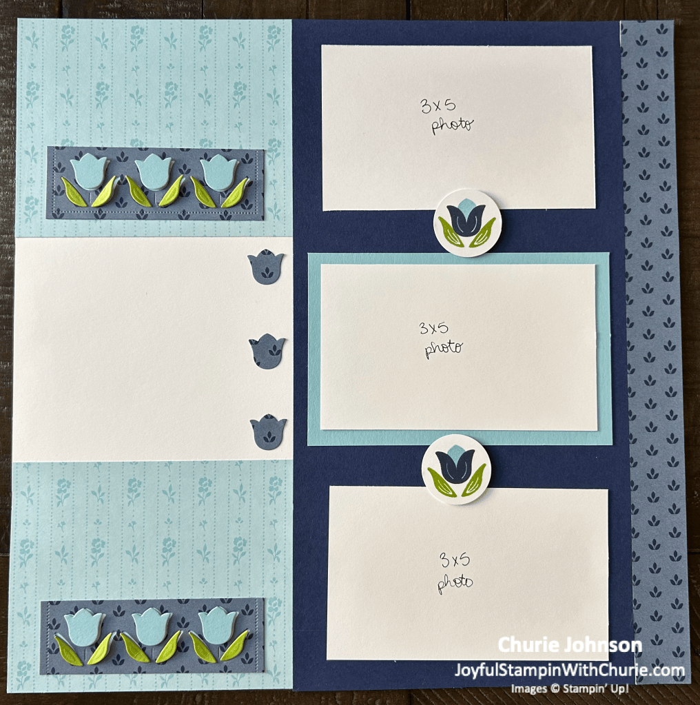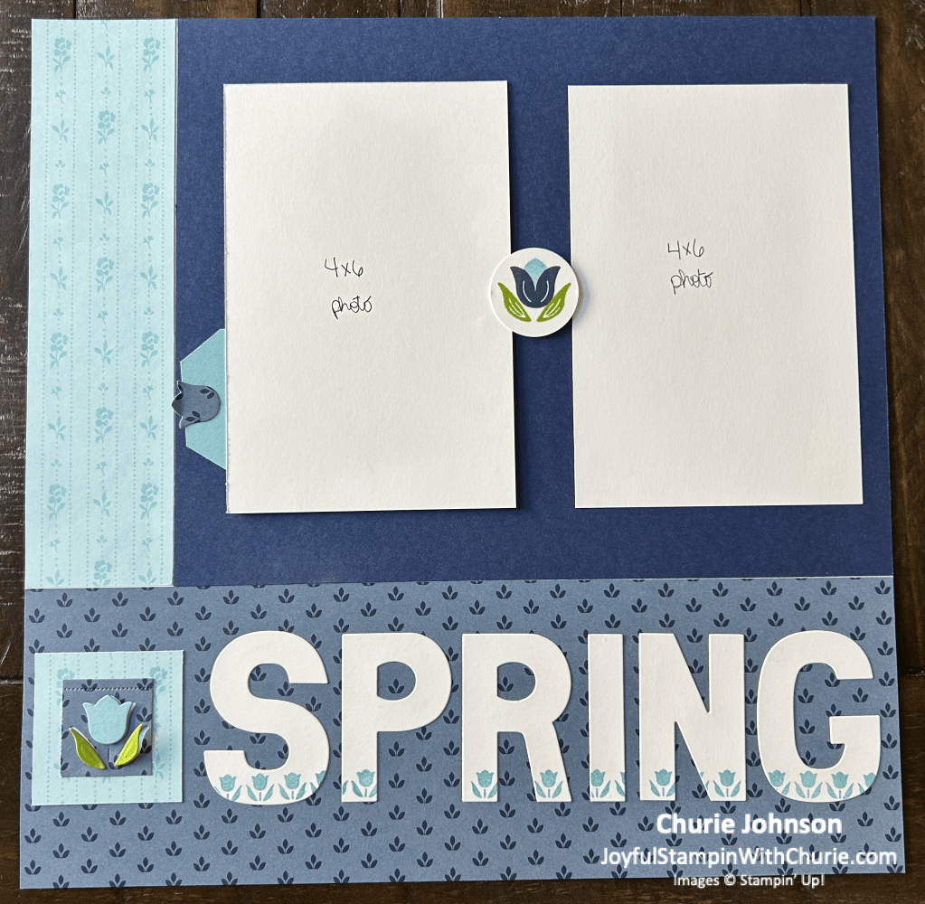 I created this 2-page scrapbook layout using the Stampin’ Up Sunshine & Tulips bundle. I incorporated the die cut tulips and stamped tulips on this project. I think the True Blue Florals 12″ x 12″ Designer Series Paper (DSP) worked very well for this project. The the True Blue Florals 12″ x 12″ Designer Series Paper (DSP) was the Stampin’ Up Product of the Month and is still available while supplies last.