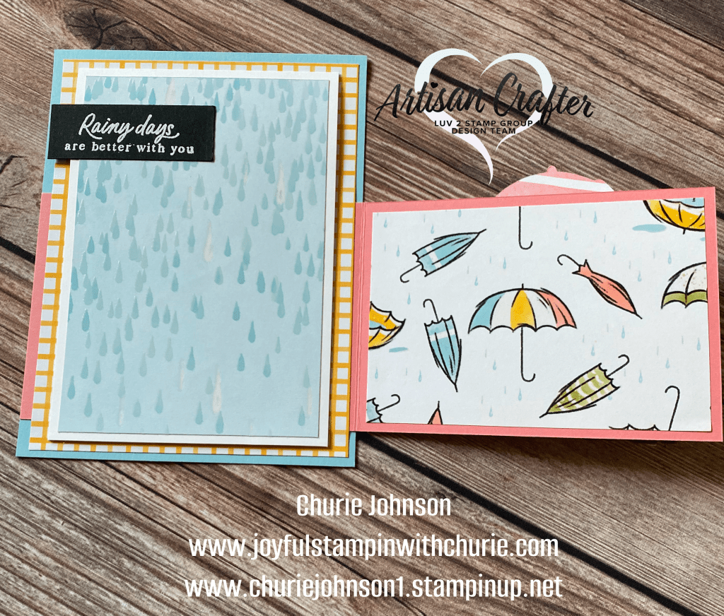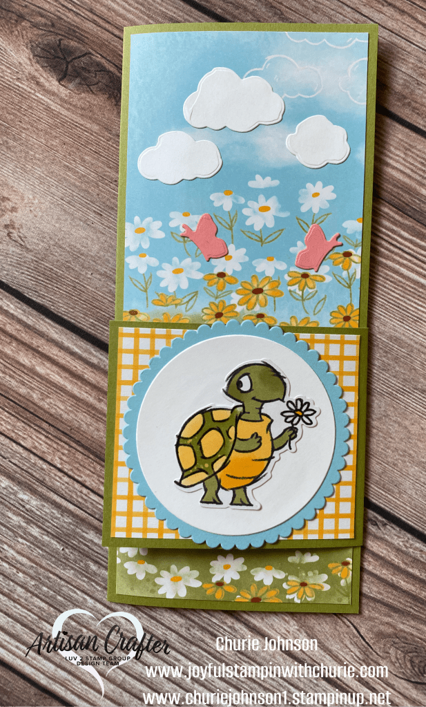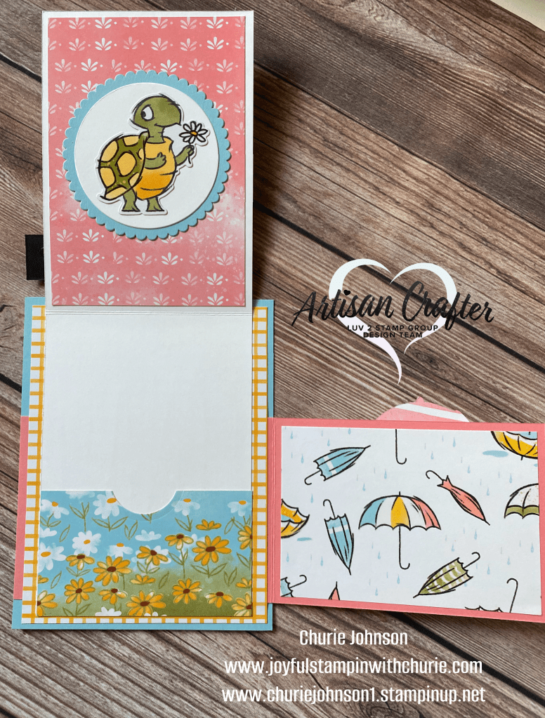 The Stampin’ Up Rain or Shine suite is so fun to create with. The Designer Series Paper (DSP) in this suite make it easy to create amazing projects. For this first project I created this cute fun fold Slimline card (8″ x 3.5″) that also has a pocket for a gift card. The flap is 7″ x 3″ (folded at 3.5″) and is tucked under the layer inside of the card. The gift card pocket is 3.25″ x 2″ and I used a small circle die to cut out the little notch on the top