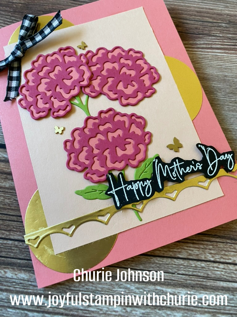 Mother’s Day is just around the corner. How exciting! I created this pretty Mother’s Day card using the Marigold Moments Bundle which is on the retiring list… it is available to order until the end of April while supplies last. The card base is 4.25″ x 5.5″. I used the 1.75″ circle to punch out three circles out of the gold cardstock for the background to give it some pizazz. I also used the Marigold Moments dies to create the gold border. The petal pink layer is 3.25″ x 4.5″. I used the Marigold Moments dies to create the beautiful flowers. I just love the Melon Mambo layered on top of the Flirty Flamingo to create the flower with the Granny Apple Green stem with leaves. Next, I embossed the sentiment on the black cardstock using the white embossing powder and heat tool. The sentiment was a little larger than I desired for this card so I fussy cut the white embossed sentiment out which made it smaller for the look I was wanting to achieve.