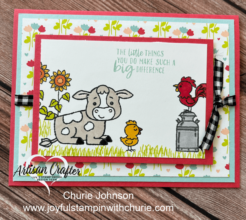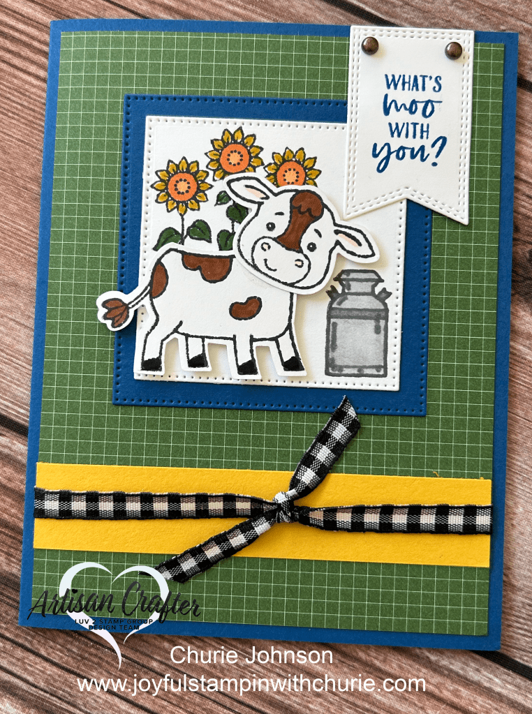 This little cow is the cutest. 🙂 I made this card using the Stampin Up Cutest Cow bundle and paired it with the Sweet Thoughts Memories and More Card Pack. I stamped the sunflowers and milk jug images onto the Basic White Cardstock and colored them using the Stampin Blends and markers. Next, I stamped the cow images onto Basic White Cardstock and colored them using the Pecan Pie Stampin Blends. I adhered the cute cow to the card using Stampin Dimensionals. After creating the main scene, I stamped the sentiment onto the banner using the Blueberry Bushel Classic Stampin Pad. To add some pizzaz to the card, I placed two Rustic Metallic Adhesive-backed dots to the banner and tied some Black and White Gingham Ribbon onto the card.