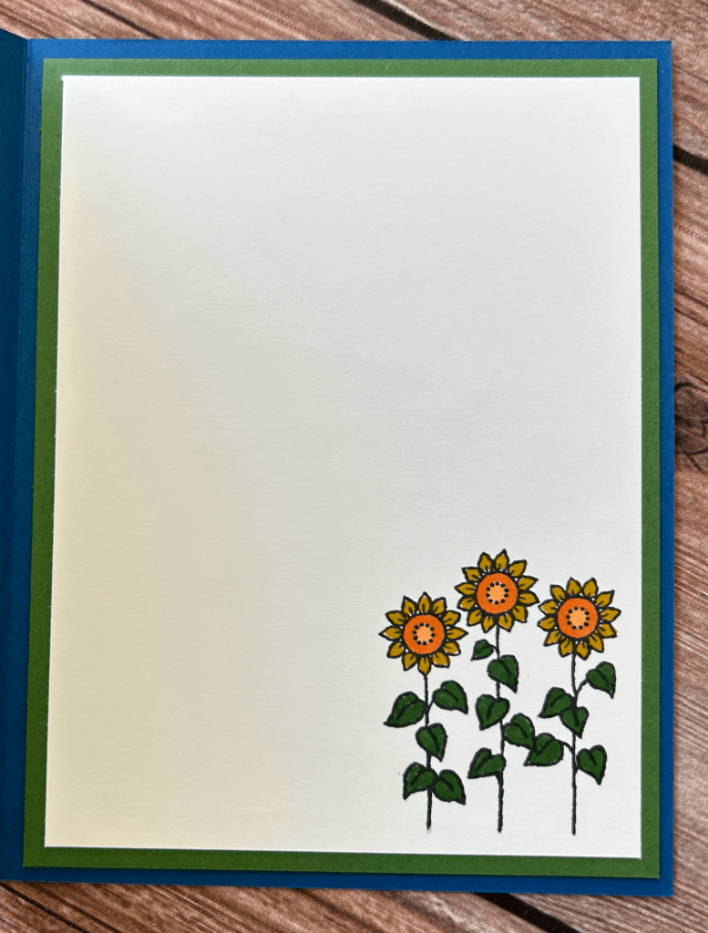 I stamped the sunflowers inside of the card and colored them using the Stampin Blends and markers. The Garden Green layer is 5.25″ x 4″. The Basic White layer is 5″ x 3.75″.