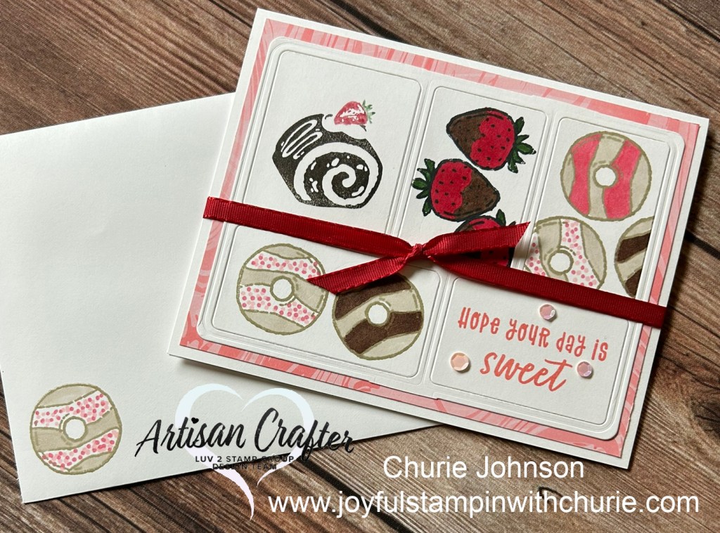 I stamped the various images from the stamp sets using the Memento Tuxedo Black stamp pad into the different sections of the Gone Fishing die and then used the Stampin’ blends and markers to color them. For the sweet treat with the strawberry on top of if, I used the Early Espresso stamp pad to ink the bottom part of the stamp and used a Real Red marker and Garden Green marker to color the strawberry and leaves images of the stamp, and then I stamped the image on the Basic White cardstock. Next, I stamped the sentiment in Flirty Flamingo in the lower right hand section. Lastly, I added some real red ribbon and adhesive backed sequins to the card to add some pizzaz.
